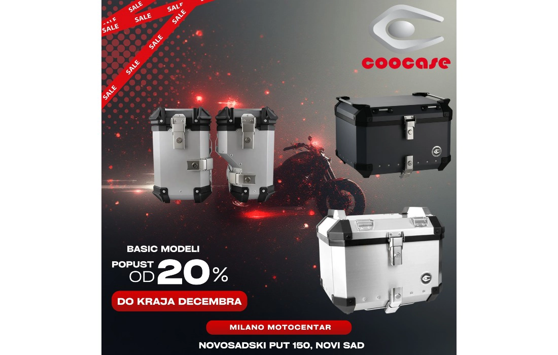 poseti naš webshop www.motocentar.shop i ostvari 20% popusta na COOCASE alu kofere i nosače - u periodu od 27.11.-06.12.2025.